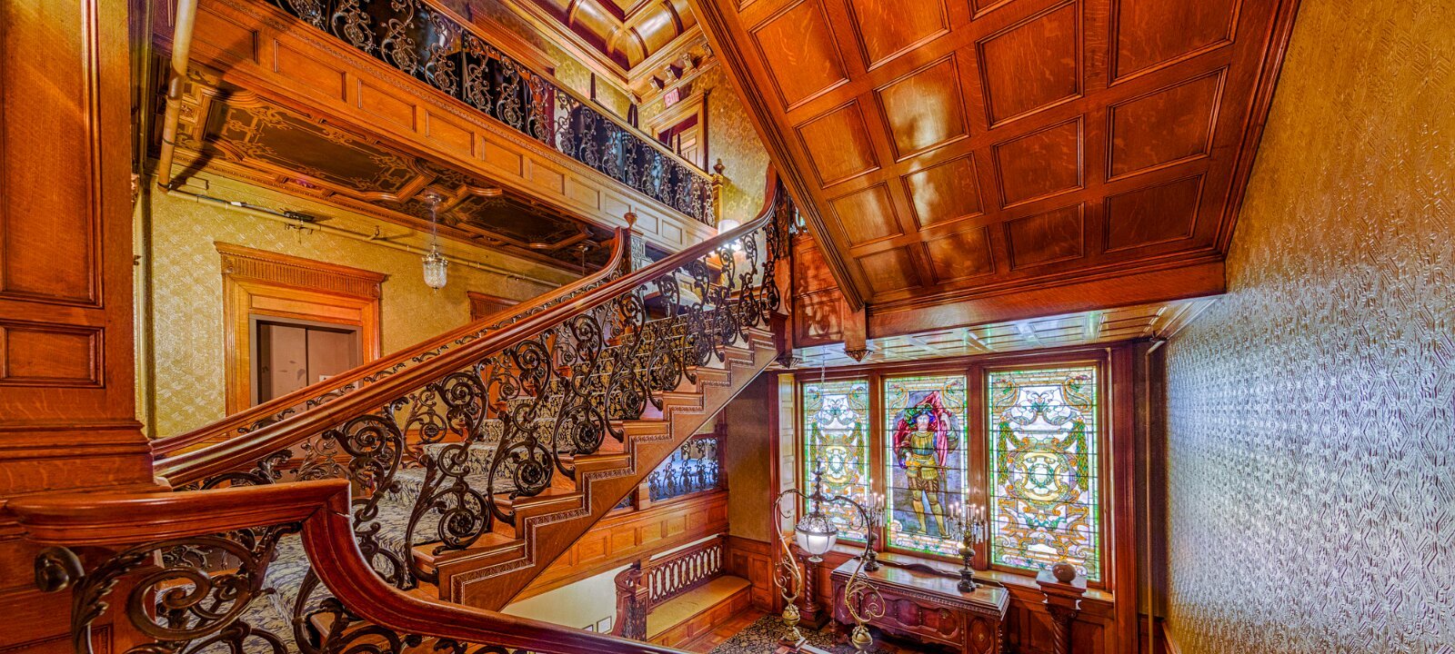 19 The David Whitney House was built between 1890 and 1894 by the famous lumber baron David Whitney Jr., who was considered not only one of Detroit's wealthiest personalities, but also one of Michigan's wealthiest citizens.[5] The house is estimated to cost $400,000 (approximately $10,500,000 in today's economy) and was featured in several newspapers of that time. The exterior is constructed using pink jasper from South Dakota. It is measured to be 21,000-square-foot (2,000 m2) and has 52 rooms (including 10 bathrooms), 218 windows, 20 fireplaces, and a secret vault in the dining room, an elevator, and numerous Tiffany glass windows. The Tiffany glass windows have been estimated to be worth more than the house itself. Architect : Gordon W. Lloyd.